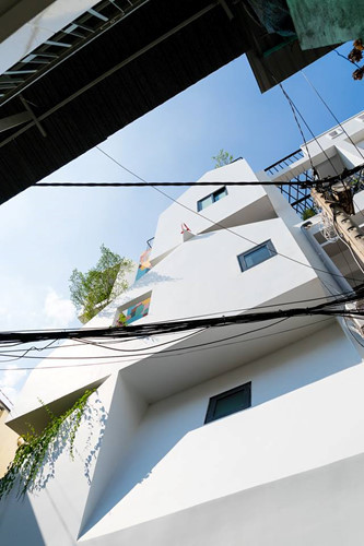 Nổi bật giữa các công trình san sát nhau ở quận 10 (Sài Gòn) là ngôi nhà phố với mặt tiền gồm nhiều mái nhà ghép lại với nhau.