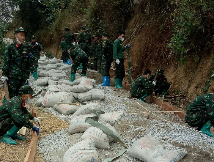 | Bộ đội Trung đoàn 141 tham gia làm đường liên thôn ở xã Bằng Hữu, huyện Chi Lăng. |