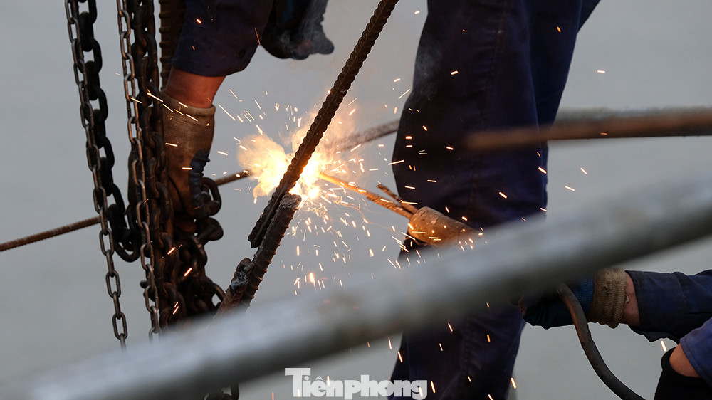 | Công nhân liên danh nhà thầu đang tất bật thi công trên công trường Dự án Cầu Vĩnh Tuy giai đoạn 2 những ngày cuối cùng của năm 2022. |