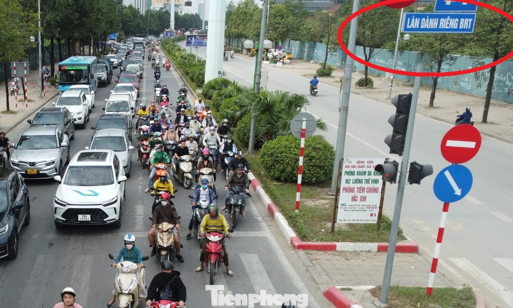 | Trục đường Tố Hữu - Lê Văn Lương có làn đường dành riêng cho xe buýt BRT, nhưng do ùn tắc qua công trường thi công nên xe máy đã đi lấn vào. |