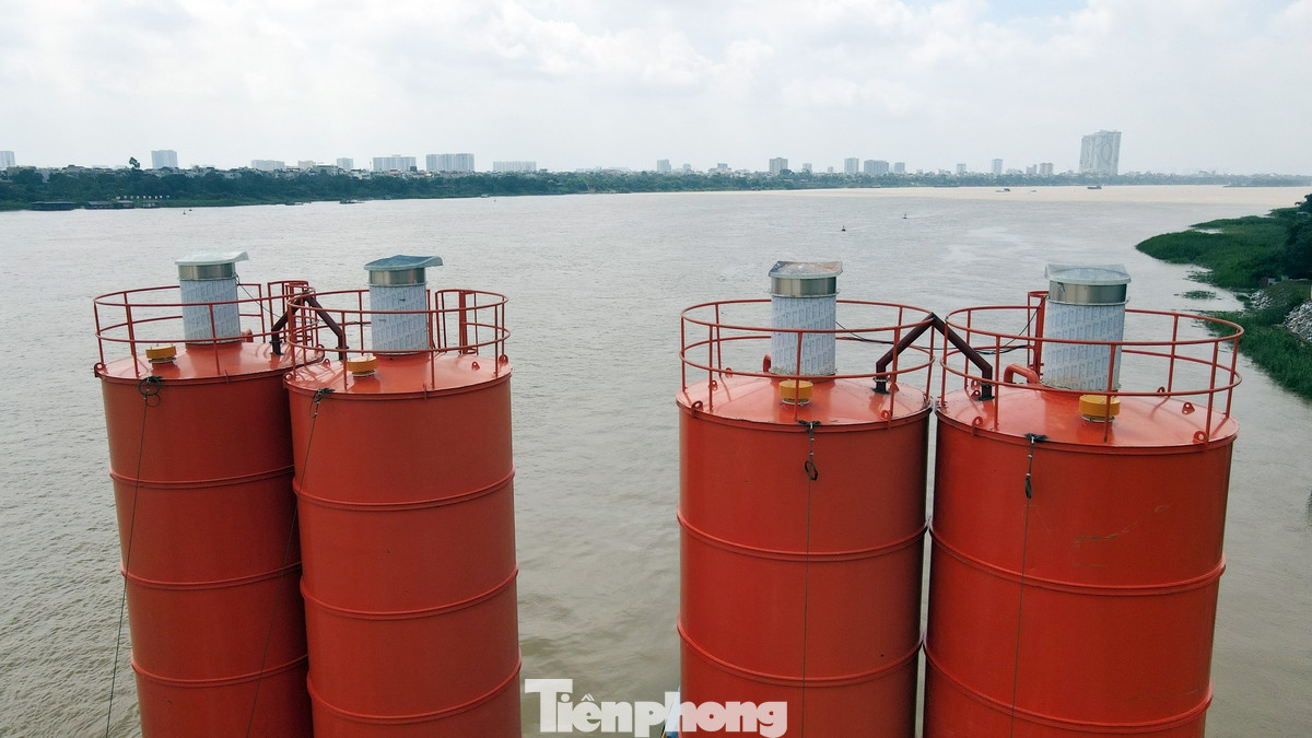 | Công trường xây dựng cầu Tứ Liên khu vực bờ Đông sông Hồng nhìn từ trên cao. |