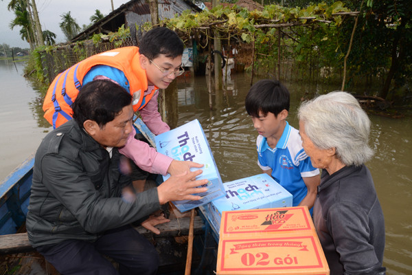 Chiều cùng ngày, đoàn cứu trợ tiếp tục lên xuồng máy đi qua cánh đồng xã Nghĩa Điền để vào khu dân cư bị chia cắt. Tại đây, hàng cứu trợ đã đến tay 20 hộ dân. Ông Tạ Phố, người đã ngoài 60 tuổi xắn quần lội nước để nhận quà rưng rưng cảm ơn Công ty BSR đã hỗ trợ lương thực, nước uống rất kịp thời. Khu dân cư ông ở bị chia cắt hơn 10 ngày nay và gần như không thể di chuyển.