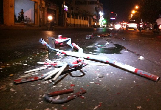 Khi đến trước trụ sở Công an phường Lạc Đạo (TP Phan Thiết), xe container bất ngờ tông và ủi sập gần 15 m dải phân cách bằng sắt. Chưa chịu dừng lại, tài xế tiếp tục cho xe lấn sang làn đường của người đi xe máy.