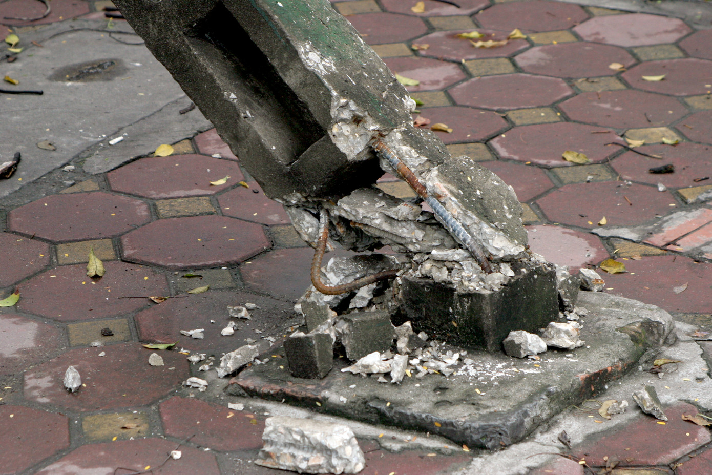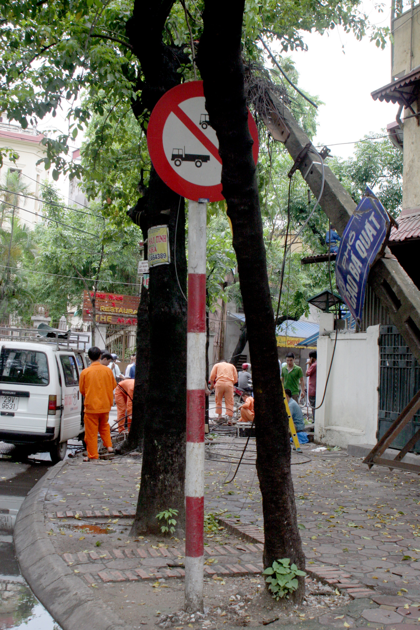 | Chiếc cột điện đổ nằm ngổn ngang cả khu phố. |