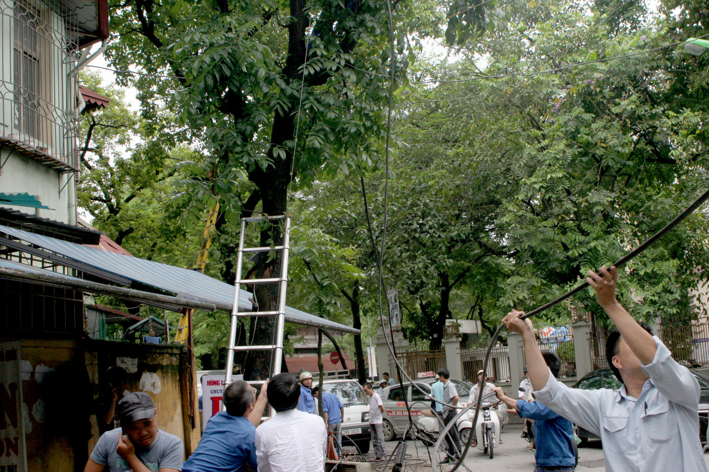 | Công nhân ngành viễn thông khắc phục sự cố. |