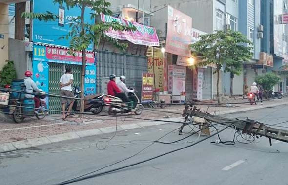 Theo quan sát, ngoài cột điện nằm vắt ngang, chiếm hết lòng đường, 2 cây cột điện khác cũng bị nghiêng và 1 cột đèn chiếu sáng gẫy gập ngang thân. Các phương tiện di chuyển qua khu vực trên phải đi lên vỉa hè để tránh cây cột điện.