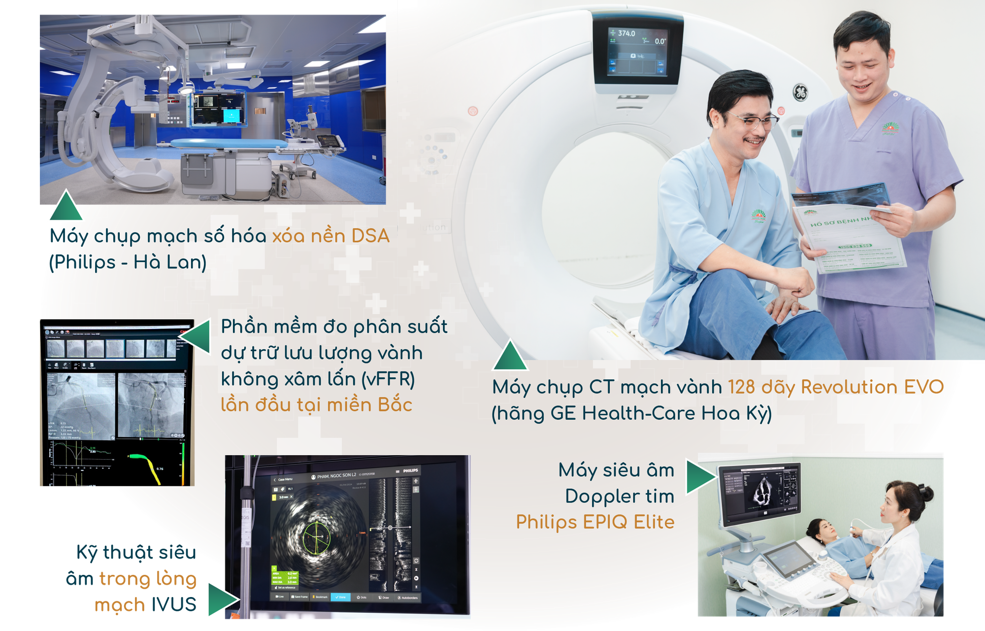 Máy chụp CT mạch vành 128 dãy Revolution EVO (hãng GE Health-Care Hoa Kỳ) tiên tiến giúp chẩn đoán hình ảnh tim mạch đa chiều, sắc nét mà không cần xâm lấn, không sử dụng tia X, cho kết quả chính xác cao. Máy siêu âm Doppler tim Philips EPIQ Elite, siêu âm Dopper mạch máu Versana Balance (GE HealthCare) là công nghệ xử lý tín hiệu mạnh mẽ, độ phân giải vượt trội so với máy siêu âm truyền thống. Đầu dò thế hệ mới tăng cường độ xuyên thấu, hình ảnh siêu âm chân thực, sắc nét, độ chuẩn xác cao. Máy chụp mạch số hóa xóa nền DSA (Philips - Hà Lan) "Tiêu chuẩn vàng" để đánh giá, chẩn đoán và can thiệp kịp thời các bệnh lý mạch vành. Kỹ thuật siêu âm trong lòng mạch IVUS giúp đánh giá gánh nặng mảng xơ vữa, xác định đường kính lòng mạch, chiều dài tổn thương từ đó định hướng chọn phương pháp can thiệp phù hợp cũng như đánh giá kết quả can thiệp đã đạt tối ưu chưa. Đặc biệt, năm 2024, Hồng Ngọc là một trong những bệnh viện đầu tiên toàn quốc đầu tư hệ thống chụp CT 1975 hiện đại nhất thế giới, giúp phát hiện chính xác tổn siêu nhỏ chỉ 0,23mm, cục máu đông, mảng xơ vữa, … tầm soát ngăn ngừa mọi nguy cơ bệnh tim mạch từ rất sớm.