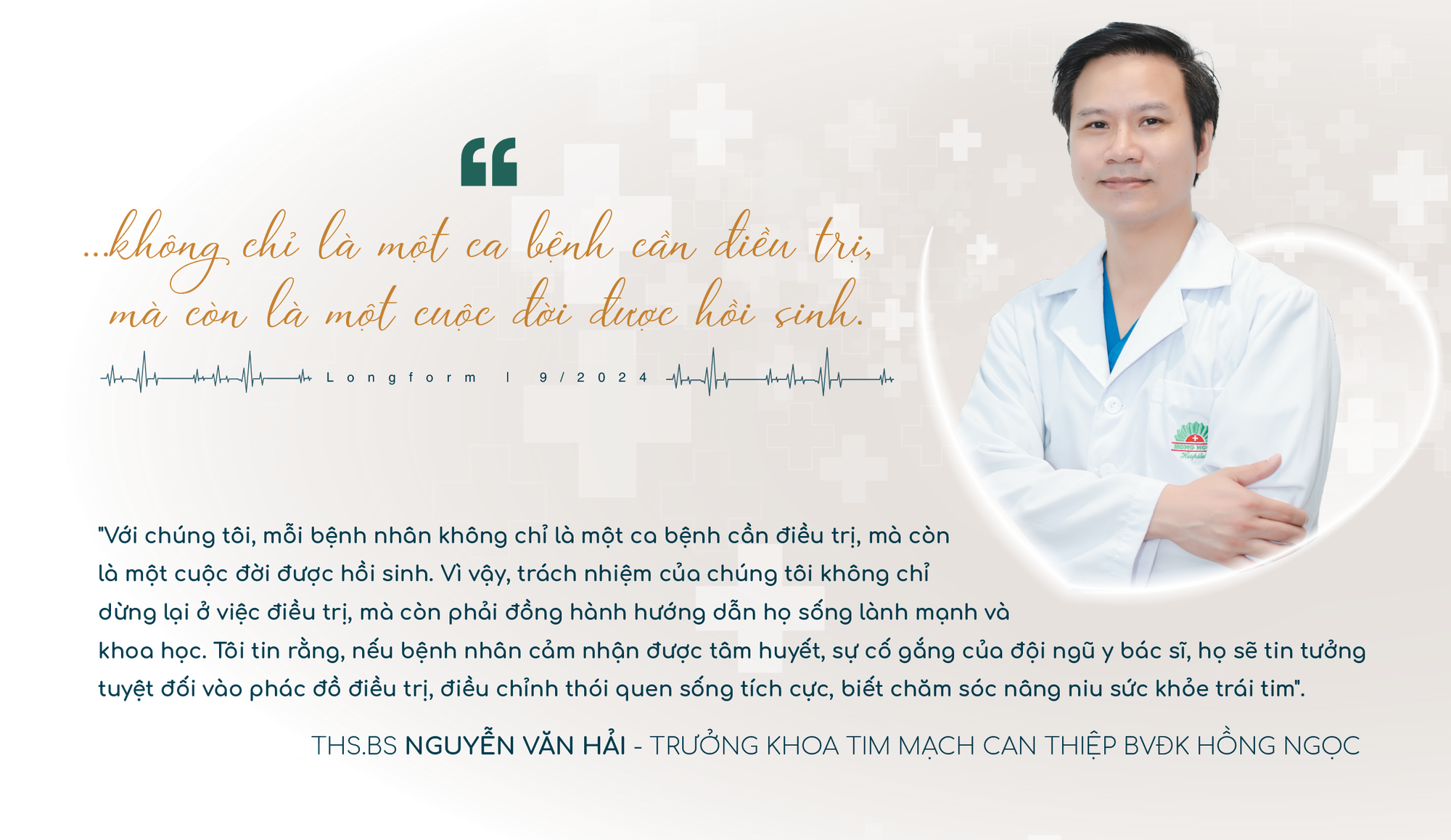 "Nhìn lại chặng đường đã qua, tôi rất tự hào trước những bước tiến vượt bậc trong can thiệp và điều trị bệnh tim mạch khi được áp dụng các công nghệ tiên tiến nhất hiện nay. Mỗi thành tựu đạt được, mỗi ca cấp cứu thành công, mỗi bệnh nhân được chữa khỏi không chỉ là kết quả của ứng dụng tiến bộ mới, mà còn là minh chứng cho sự nỗ lực không ngừng của tập thể y bác sĩ tận tâm, luôn đặt trái tim và trách nhiệm của mình vào từng ca bệnh. Đây cũng chính là thành quả của chiến lược đầu tư đúng đắn, lâu dài vào công nghệ mới và không ngừng nâng cao trình độ y bác sĩ của Ban Lãnh đạo BV Hồng Ngọc. -ThS.BS Nguyễn Văn Hải - Trưởng khoa Tim mạch Can thiệp BVĐK Hồng Ngọc cho biết.