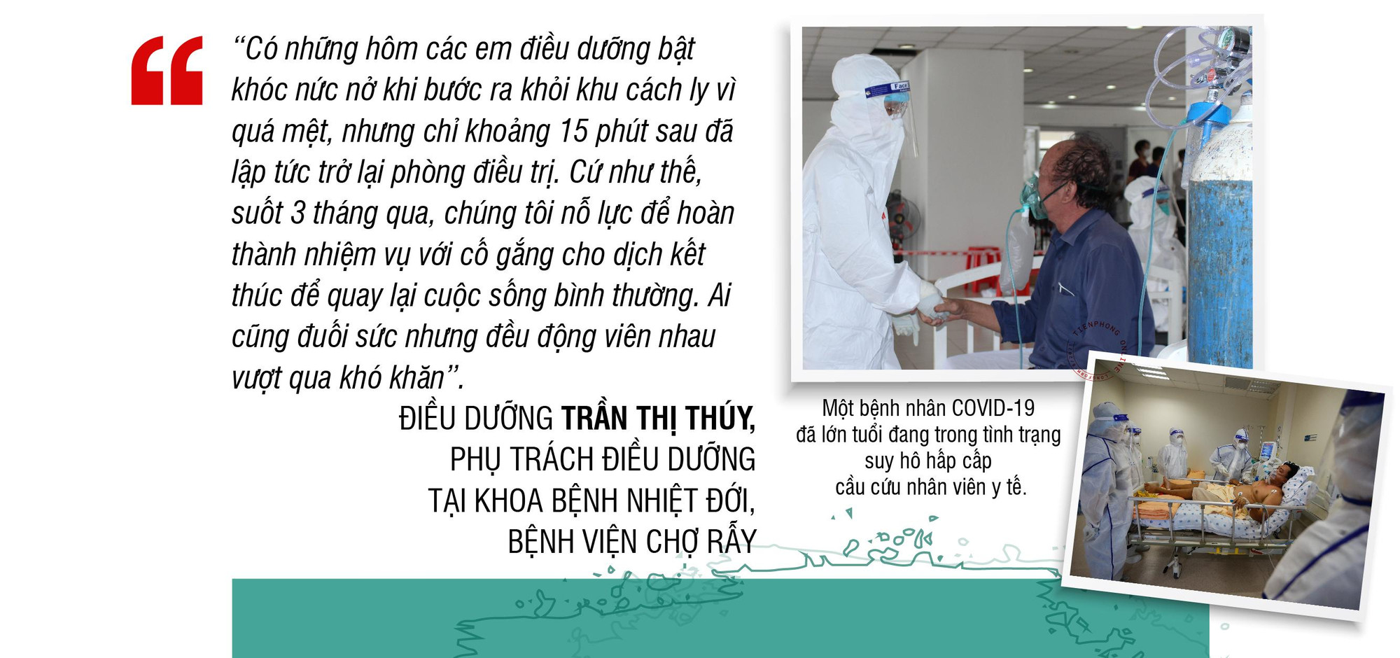 Theo BS Nguyễn Hoài Nam, Phó giám đốc Sở Y tế TPHCM, đến nay đã có hơn 900 y bác sĩ trực tiếp tham gia chống dịch, điều trị cho bệnh nhân bị mắc COVID-19. Ngoài những khó khăn vất vả trong công việc, các y bác sĩ còn đối mặt với những rủi ro rất lớn khi biến chủng Delta lây nhiễm rất cao. Lực lượng y tế đang nỗ lực làm việc bằng ý chí để giành giật sự sống cho bệnh nhân với mục tiêu cứu chữa được càng nhiều người bệnh càng tốt.