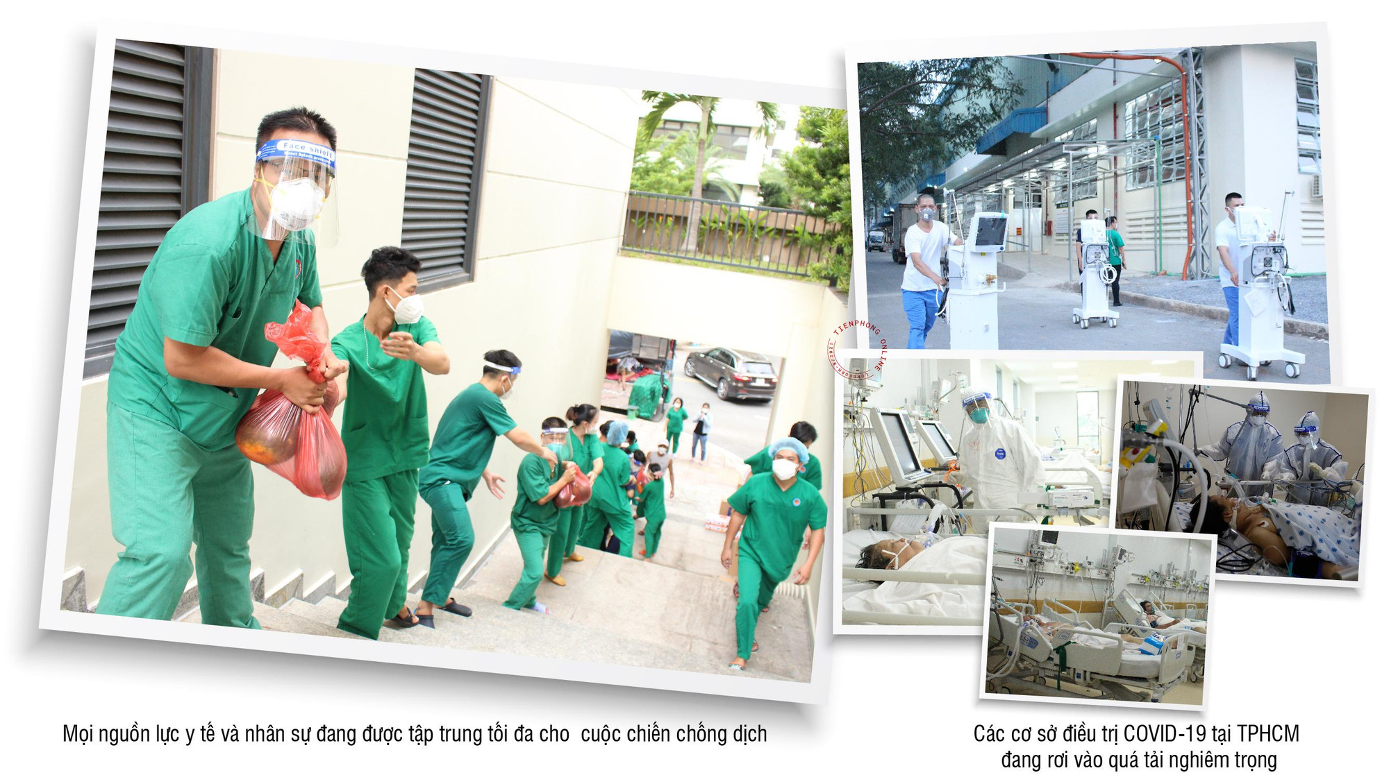 Khi bệnh nhân tăng lên hàng nghìn ca mỗi ngày kéo theo số ca bệnh nặng tăng nhanh, các bệnh viện tuyến quận huyện đã phải chuyển trạng thái sang hoạt động theo mô hình tách đôi (nửa điều trị COVID-19 nửa còn lại điều trị bệnh lý thông thường). Các bệnh viện tư cũng tham gia tiếp nhận điều trị bệnh nhân COVID-19 nhưng vẫn không đủ đáp ứng. Hệ thống 16 bệnh viện dã chiến cùng các cơ sở điều trị với tổng công suất 50.000 bệnh nhân nhanh chóng rơi vào quá tải.