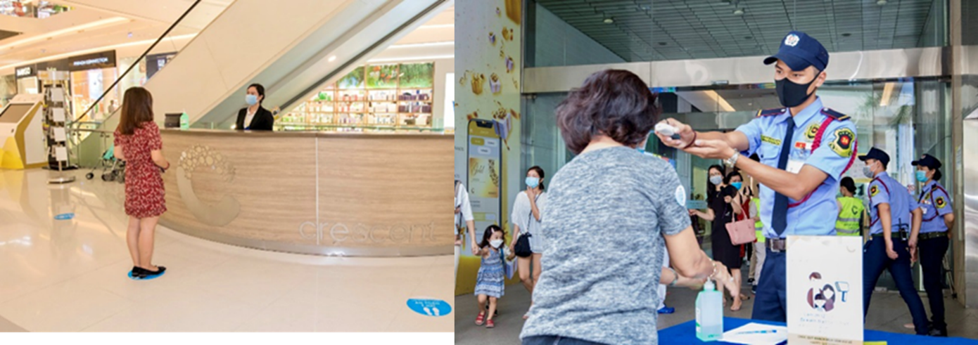 Chuẩn bị kỹ lưỡng cho việc hoạt động trở lại, Crescent Mall và các đối tác khách thuê đã triển khai đội ngũ làm vệ sinh và tiến hành khử trùng, dọn dẹp cẩn thận toàn bộ Trung tâm trước hai ngày. Các bảng hiệu nhắc nhở về các biện pháp an toàn và phòng ngừa dịch bệnh được đặt khắp Trung tâm.