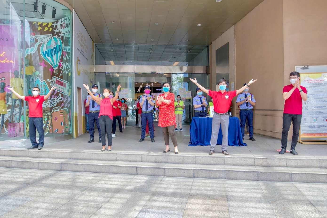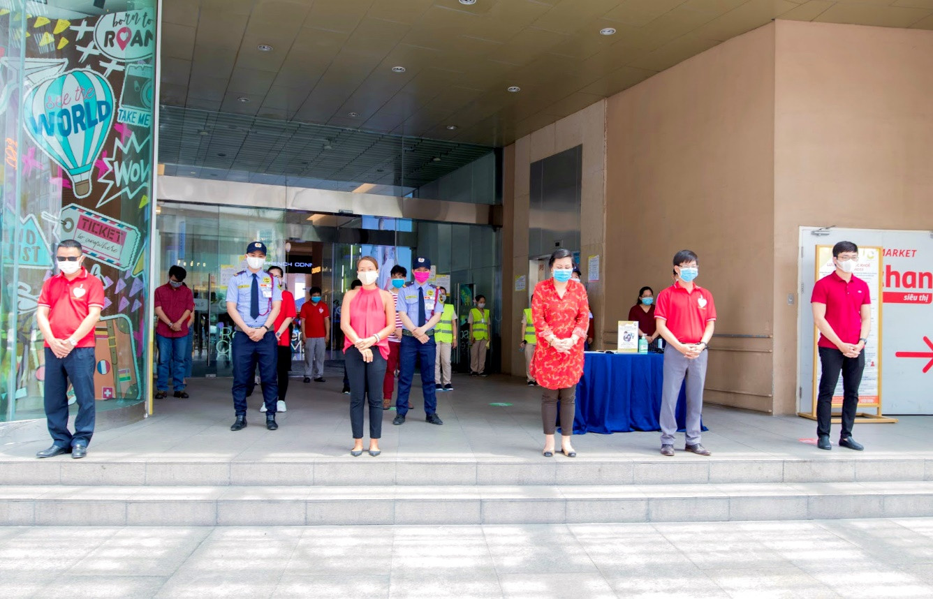 Tuân thủ đúng yêu cầu giữ khoảng cách an toàn, đại diện của Trung tâm thương mại Crescent Mall mặc trang phục màu đỏ cùng tập trung trước cửa Trung tâm gửi tặng 01 phút im lặng tượng trưng cho thông điệp của Trung tâm tới cộng đồng trong khoảng thời gian thử thách chống lại virus Corona.