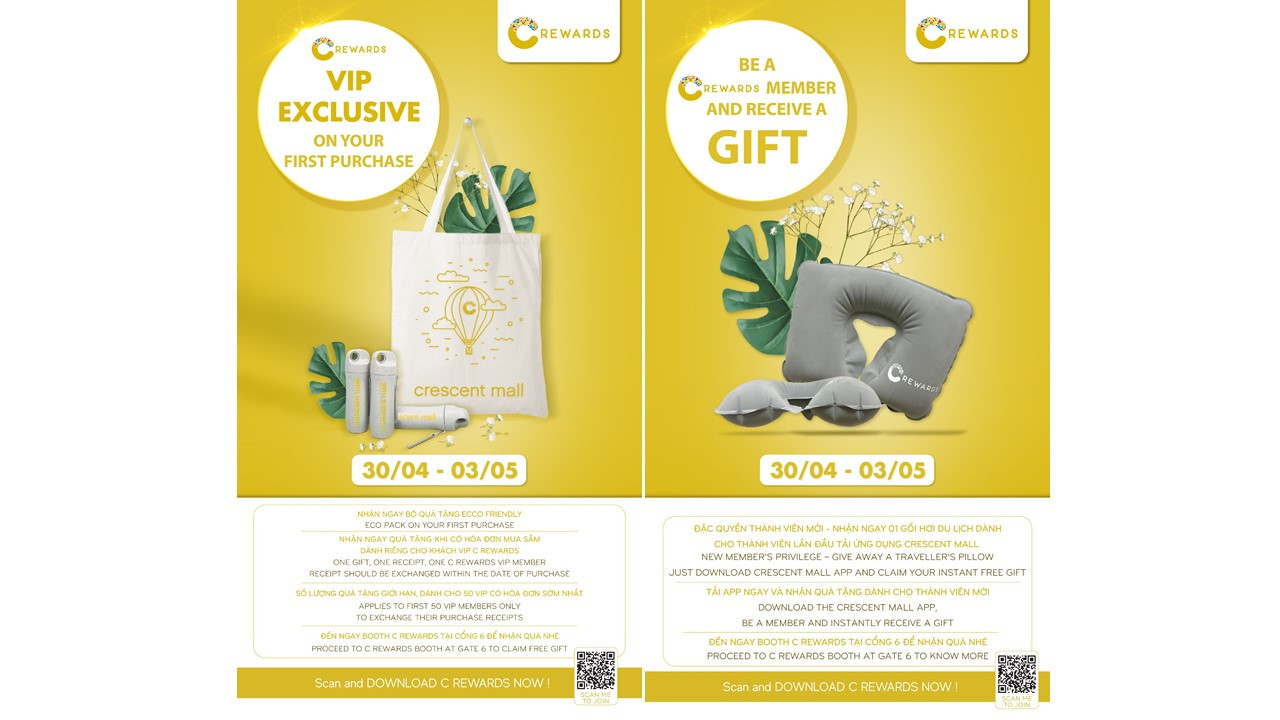 Đặc biệt! Crescent Mall còn có ưu đãi độc quyền dành cho Thành viên VIP C-Rewards trong đợt sale này. Với mỗi hóa đơn mua hàng từ 30/4 – 03/05 tại Crescent Mall, bạn đã có cơ hội nhận ngay 1 combo quà tặng thân thiện với môi trường. Ngoài ra, đối với những khách hàng là thành viên mới C Rewards, 01 chiếc gối hơi du lịch đã thuộc về bạn khi đăng ký trở thành thành viên. Nhanh chân tham gia bạn nhé!