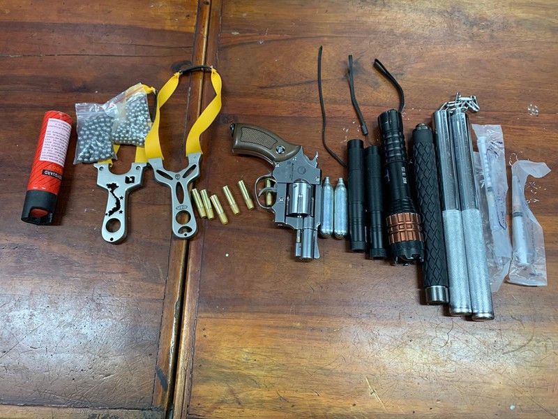 Qua kiểm tra, cơ quan công an tạm giữ một xe máy và một túi xách. Bên trong tàng trữ rất nhiều hung khí, công cụ hỗ trợ gồm: Một dùi cui bằng kim loại, côn nhị khúc, hai cây ná bắn đạn bi, một cây súng bắn đạn bi, sáu vỏ đạn dùng để bỏ đạn bi, 143 viên đạn bi sắt…