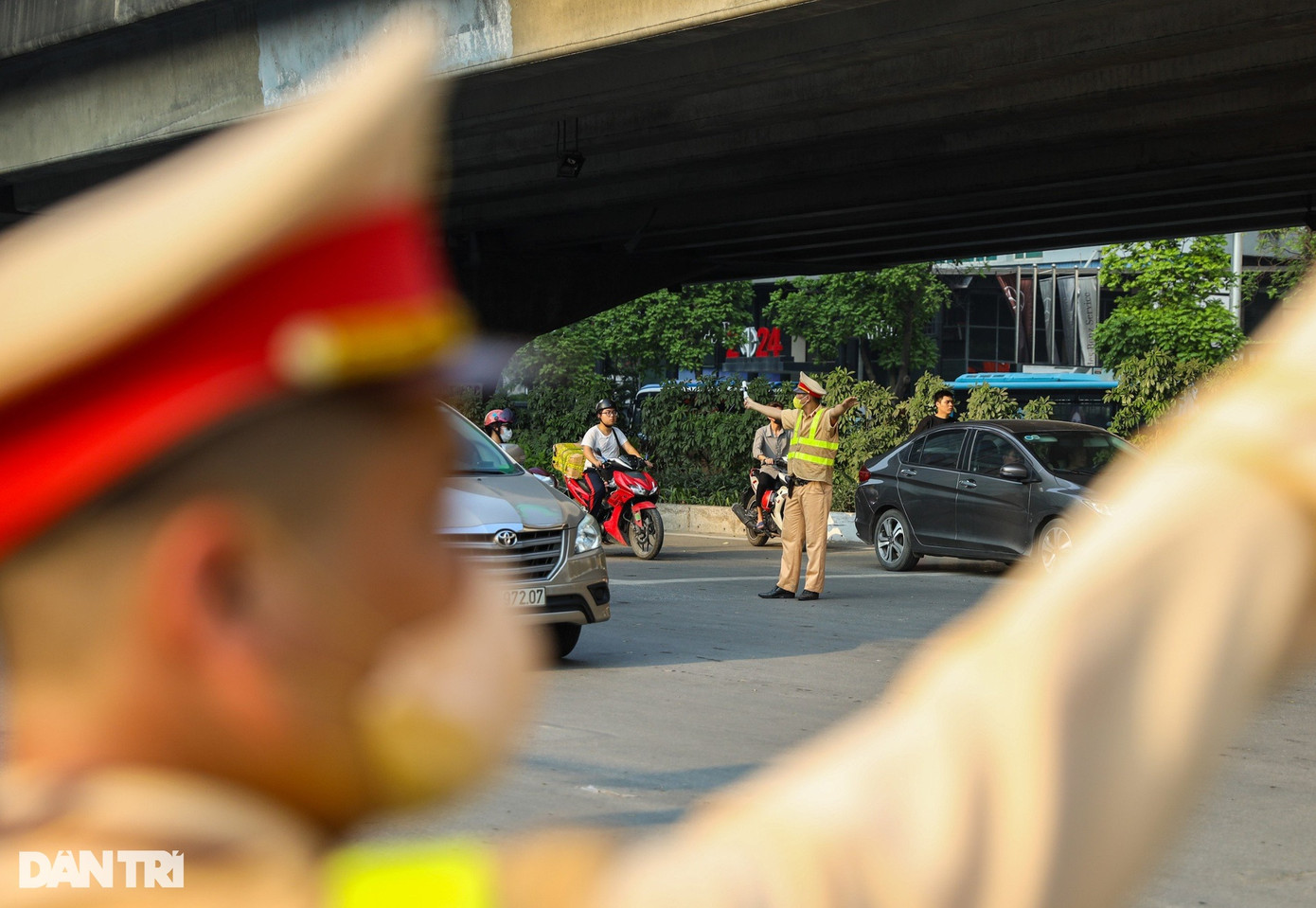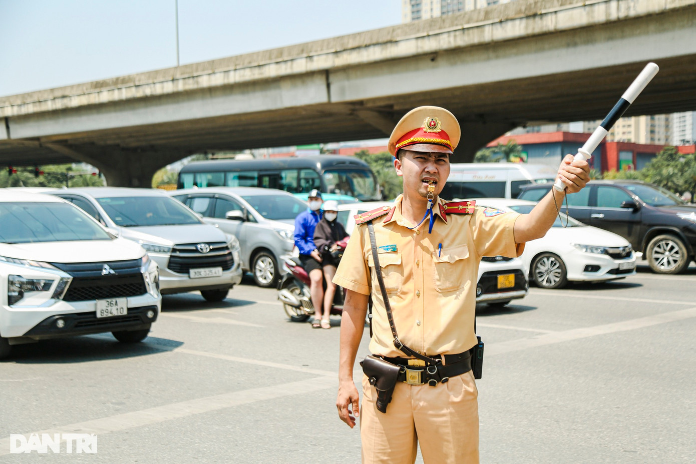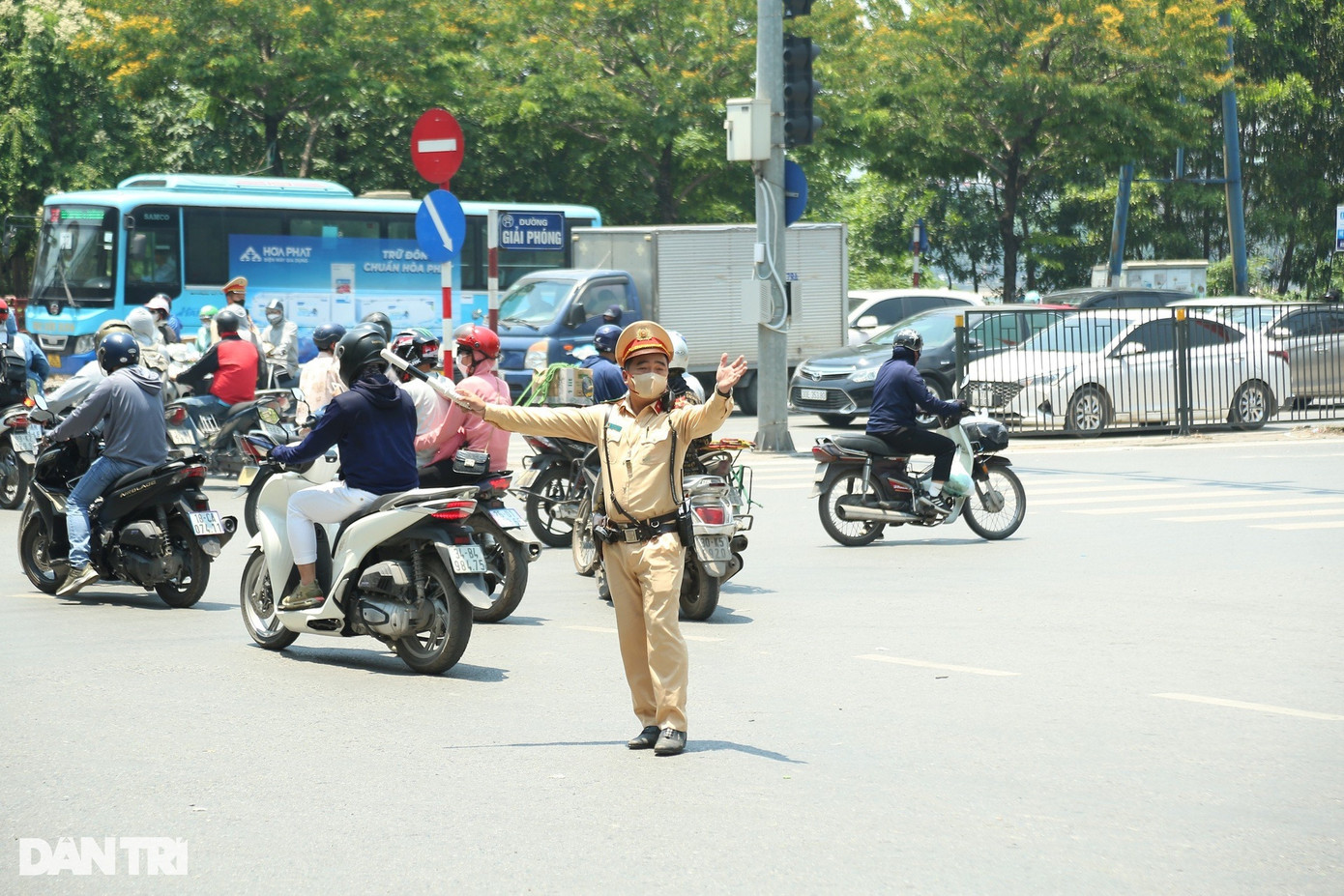 Tại chốt giao thông Pháp Vân, một điểm trọng yếu của cửa ngõ phía nam, các cán bộ Đội CSGT số 14 điều tiết giao thông dưới nắng nóng, để hạn chế tối đa tình trạng ùn tắc, giúp người dân lưu thông trở về quê nghỉ lễ 30/4 và 1/5.