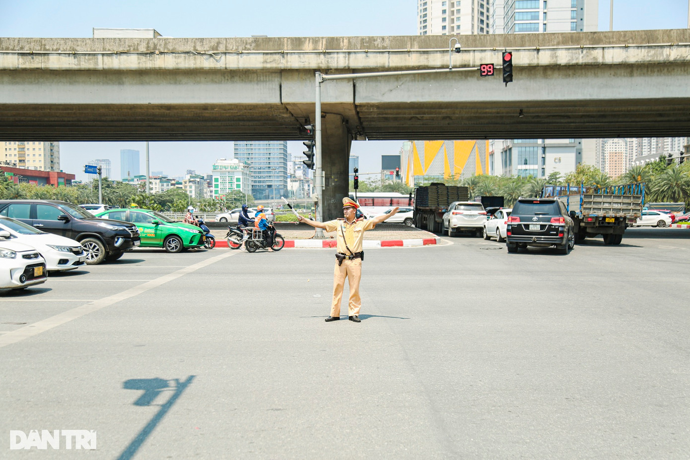Theo ghi nhận của phóng viên, lúc 10h30 cùng ngày, tại khu vực đường Trần Duy Hưng, Phạm Hùng, lực lượng cán bộ Đội CSGT đường bộ số 6 (Phòng CSGT Hà Nội) "căng mình" dưới nắng nóng gay gắt để điều tiết giao thông.