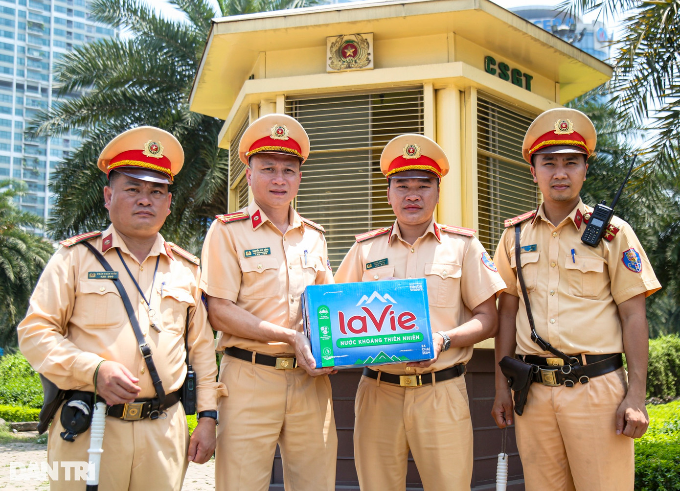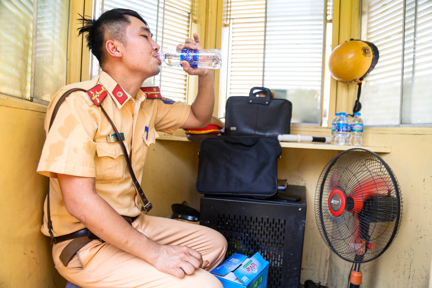 Để đảm bảo sức khỏe, cứ sau 1 giờ đồng hồ, các chiến sĩ sẽ tranh thủ 5-10 phút để nghỉ ngơi, tiếp nước, rồi lại ra ứng trực trên đường.