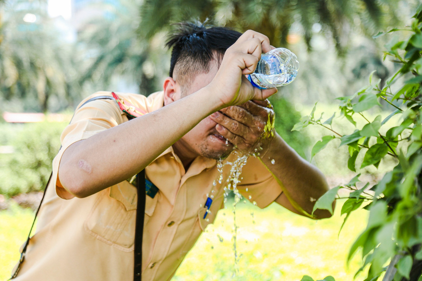 Phút nghỉ ngơi hiếm hoi của Thượng úy Nguyễn Văn Tiến, cán bộ đội CSGT đường bộ số 6 sau khi liên tục điều tiết, phân luồng giao thông suốt nửa tiếng đồng hồ dưới trời nắng gay gắt.