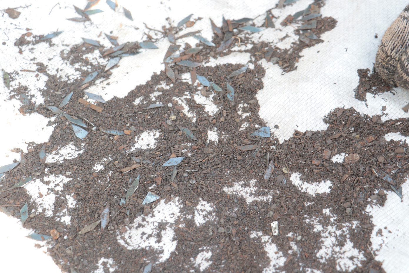 | Nhiều mảnh đinh hình thoi, sắt nhọn được thu gom. |