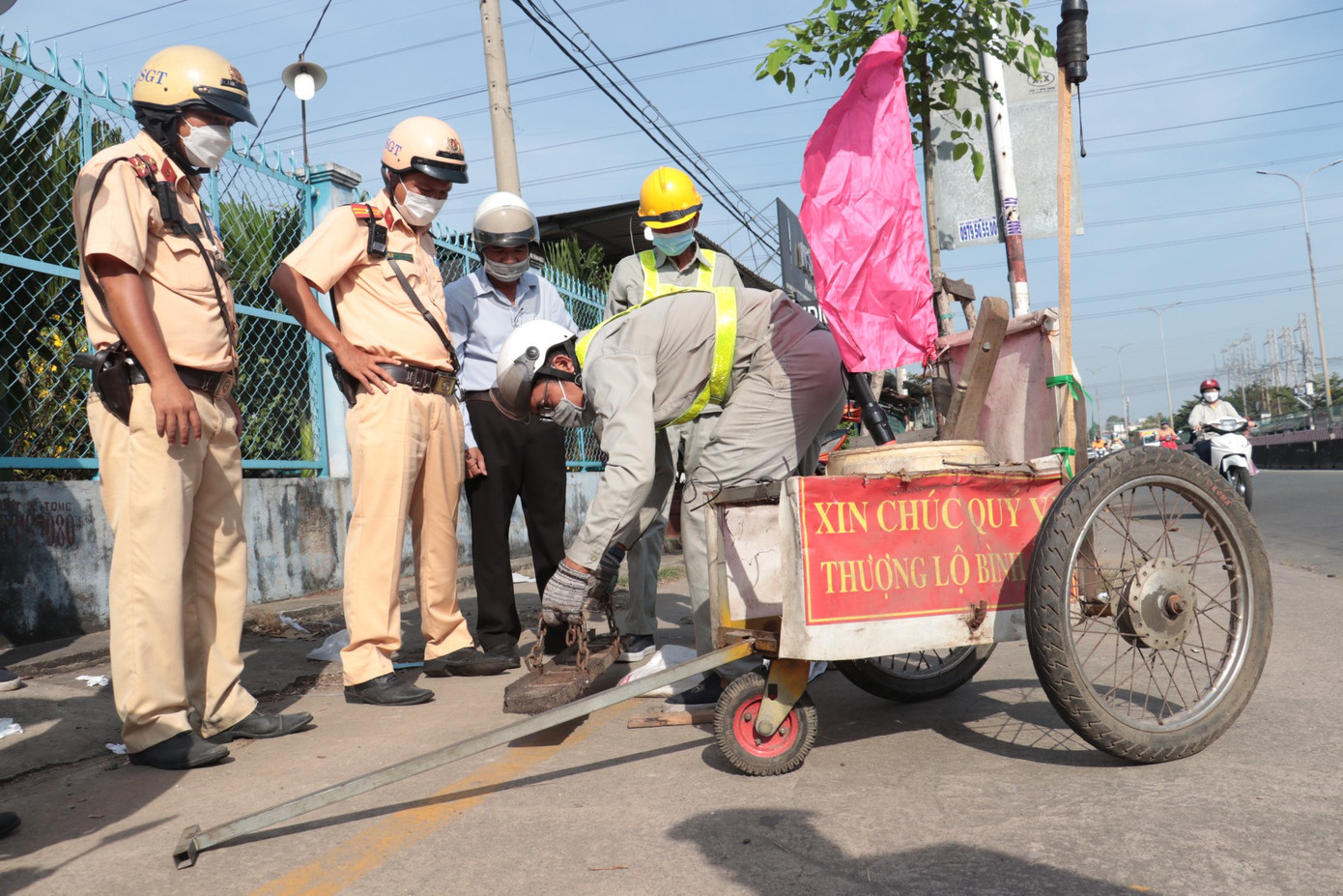 | Ngày 20/1 (29 Tết), cán bộ chiến sĩ Đội CSGT An Lạc – Phòng CSGT đường bộ - đường sắt (PC08) Công an TPHCM đã phối hợp cùng nhân viên Công ty cổ phần đầu tư phát triển hạ tầng IDICO (đơn vị phụ trách đoạn quốc lộ 1 qua địa bàn quận Bình Tân) tổ chức thu dọn và hút đinh, các vật sắc, nhọn trên đường. |