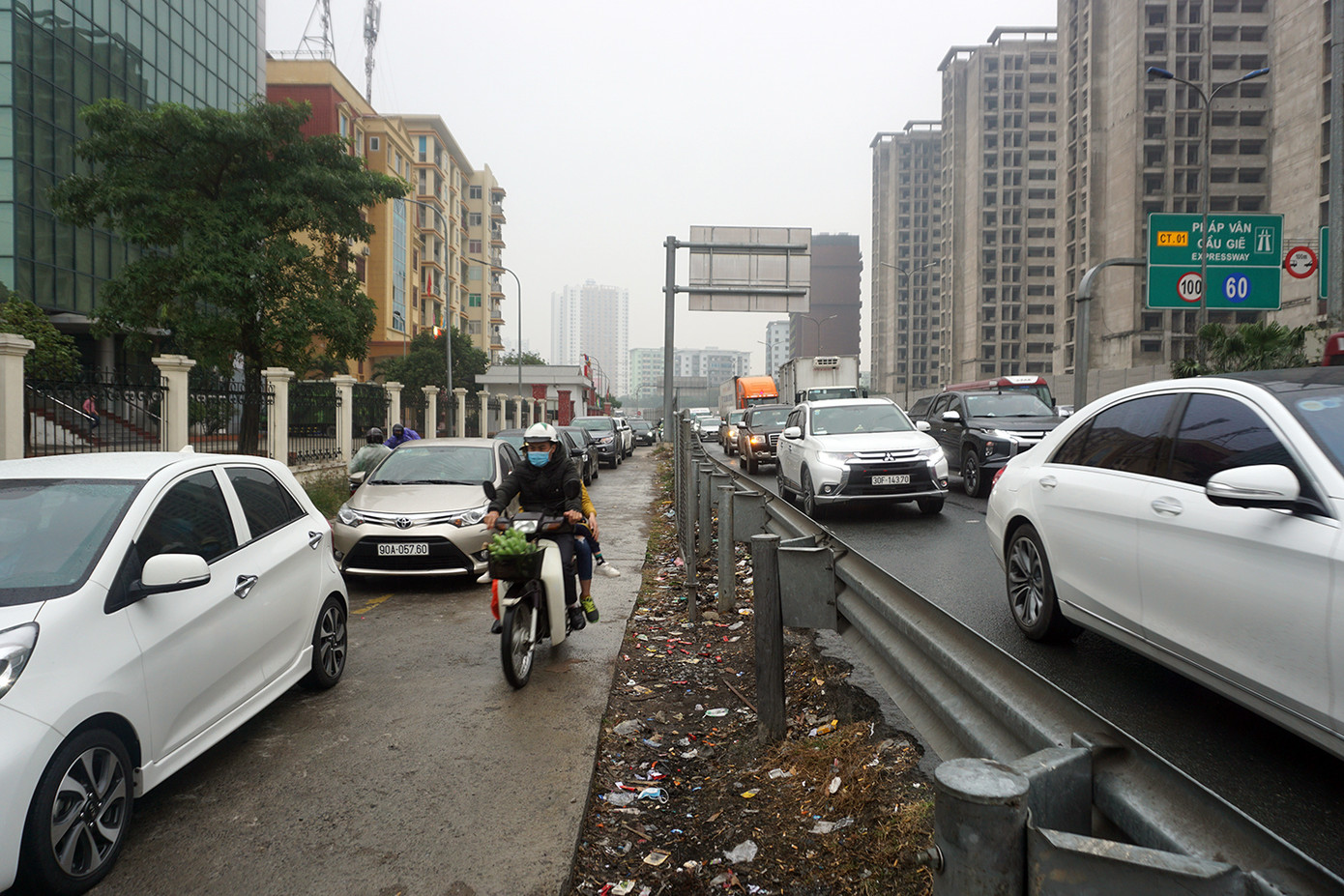 Không chỉ trên cao tốc mà ngay cả đường gom cũng ùn dài.