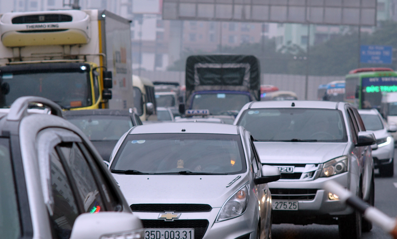 Tại khu vực nút giao với đường vành đai 3 (Hà Nội) trời mưa phùn khiến đường trơn, km 182 xảy ra tình trạng ùn ứ kéo dài khoảng 2 km.