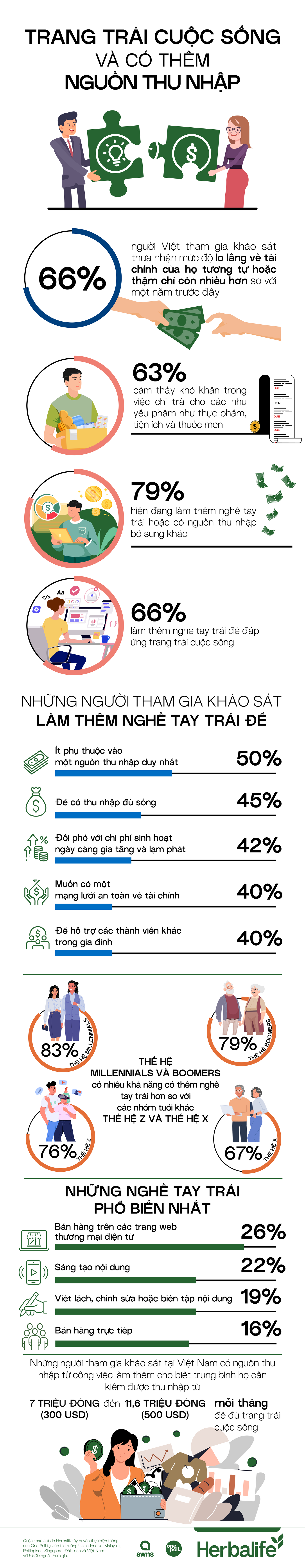 Khi được hỏi về nghề tay trái, người tham gia khảo sát cho biết những công việc phổ biến nhất bao gồm bán hàng trên các trang web thương mại điện tử; sáng tạo nội dung; viết lách, chỉnh sửa hoặc biên tập nội dung — ngoài ra bán hàng trực tiếp là công việc làm thêm phổ biến thứ tư. Những người tham gia khảo sát tại Việt Nam có nguồn thu nhập từ công việc làm thêm cho biết trung bình họ cần có thu nhập từ 7 triệu đồng (300 USD) đến 11,6 triệu đồng (500 USD) mỗi tháng để đủ trang trải cuộc sống.