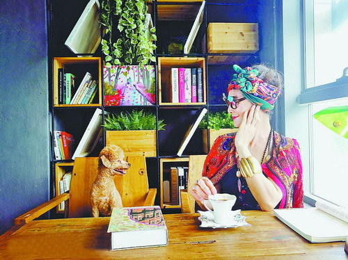 Bà Huang quý phái, sành điệu tạo dáng bên chó cưng trong tiệm cà phê.