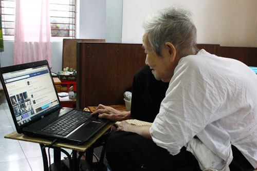 Chiếc máy tính đã cũ, những chữ cái, con số trên bàn phím được bà cụ dùng bút màu trắng tô lại cho to hơn. Sau khi chăm chú đọc tin tức rồi mở Facebook, cụ xem bảng tin, like ảnh của người này, comment trạng thái của người kia.