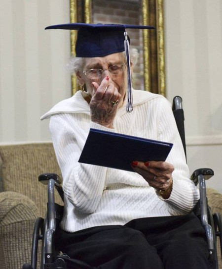 Cụ bà 97 tuổi luôn mơ ước được đi học tiếp cũng như một lần được khoác áo tốt nghiệp trung học. Mới đây, sau 79 năm rời ghế nhà trường, ước muốn của cụ bà đã thành hiện thực khi bà vinh dự nhận được tấm bằng tốt nghiệp trung học từ những người đứng đầu trường Công giáo Grand Rapids.