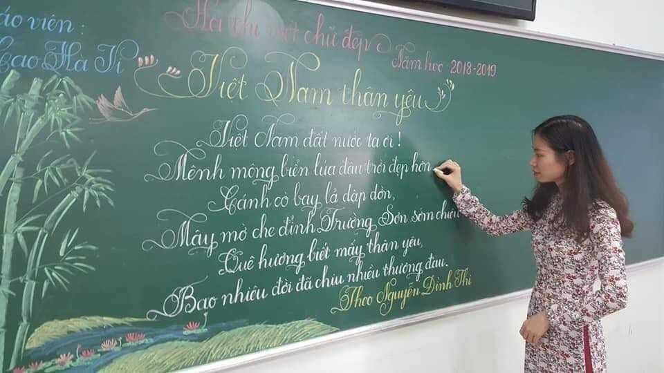 Không ai nghĩ rằng chính những dòng chữ “đẹp như in” này lại do bàn tay của cô giáo làm nên. Bên cạnh việc chữ được nhận xét là “như biết uốn lượn”, các cô giáo đã “tùy cơ ứng biến” các họa cảnh, cách điệu kiểu chữ sao cho phù hợp với đề tài con người – quê hương – đất nước mà mình nhận được.
