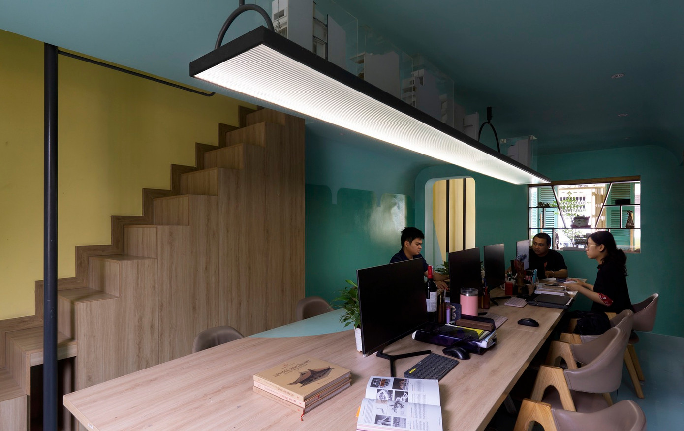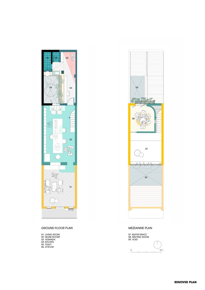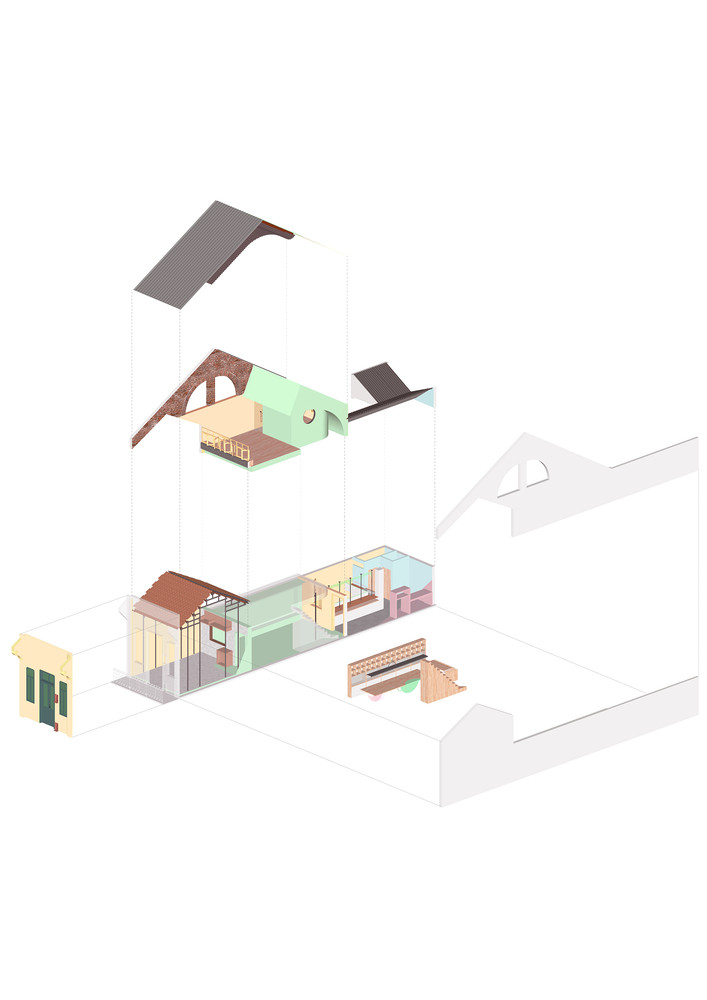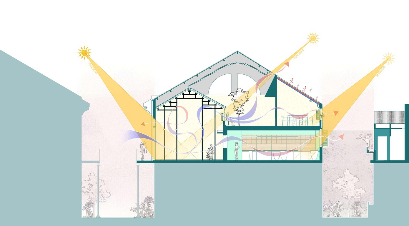 Việc cải tạo tập trung khai thác giá trị của những giếng trời và tiếp tục để mặt tiền kết nối trực tiếp với sân chung để kết nối trong - ngoài, cũ -mới. Một lớp mái mới được tạo bao phủ lên mái cũ có tác dụng làm mát, giếng trời và khe sáng được bố trí chính xác để lấy nắng từ mái xuống 2 tầng nhà.