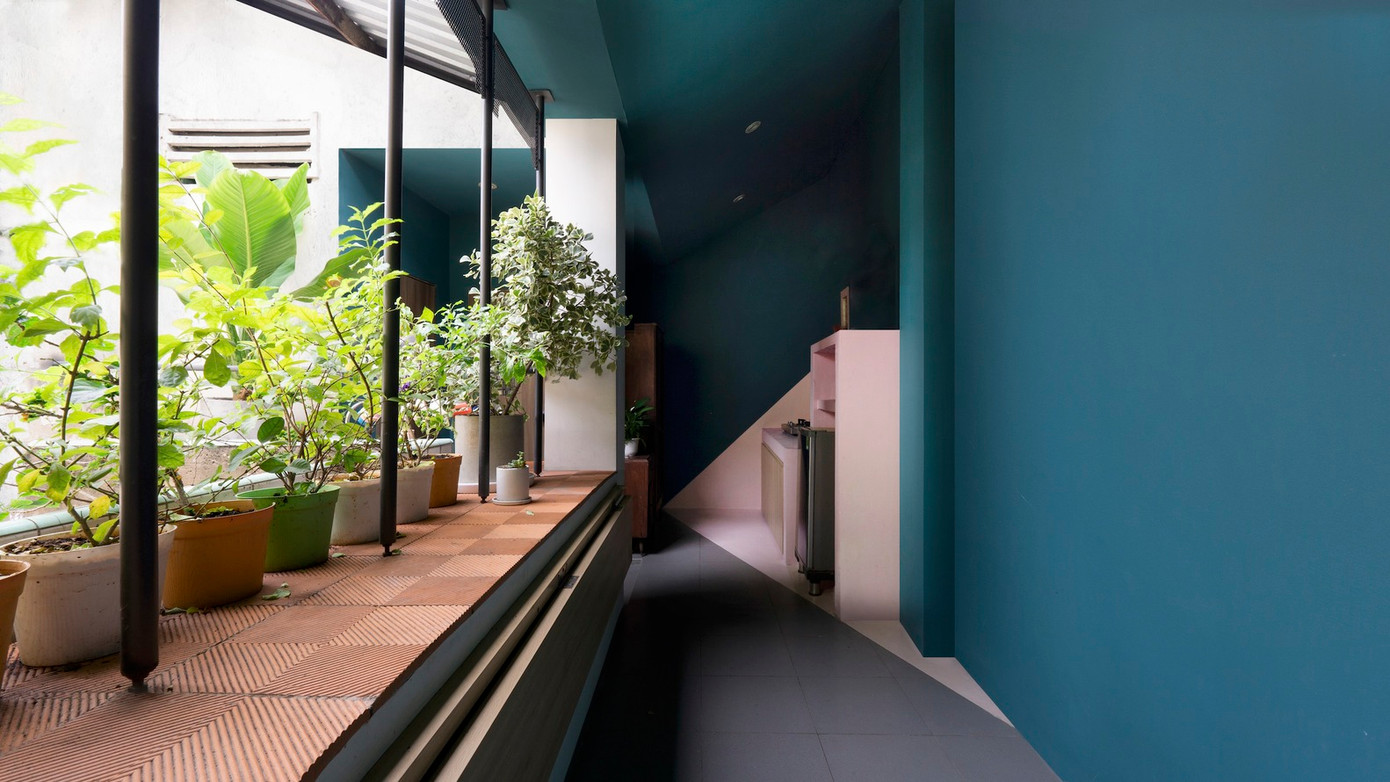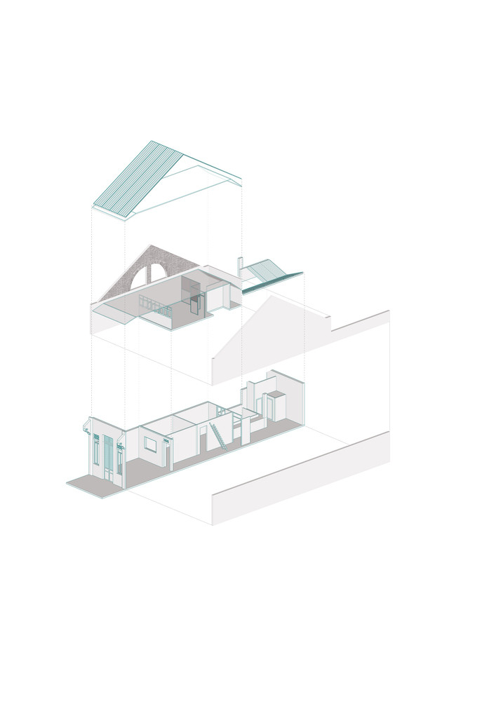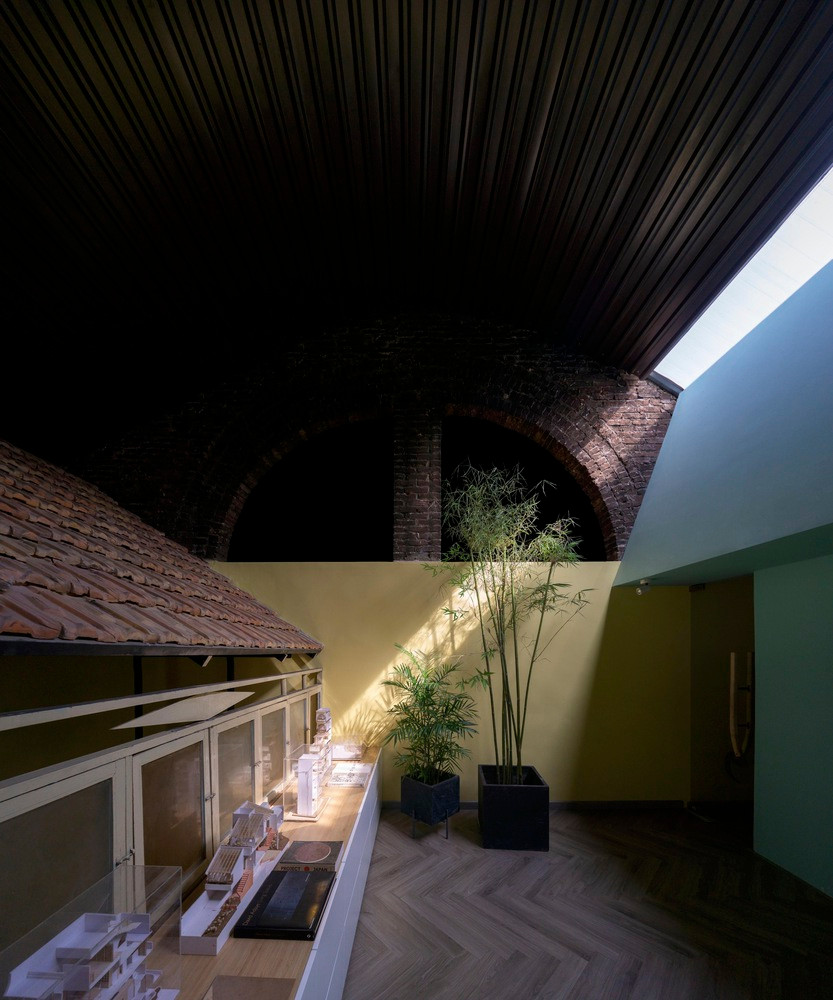 Việc cải tạo tập trung khai thác giá trị của những giếng trời và tiếp tục để mặt tiền kết nối trực tiếp với sân chung để kết nối trong - ngoài, cũ -mới. Một lớp mái mới được tạo bao phủ lên mái cũ có tác dụng làm mát, giếng trời và khe sáng được bố trí chính xác để lấy nắng từ mái xuống 2 tầng nhà.