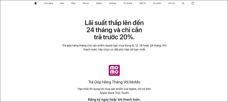 Apple cung cấp các gói trả góp hàng tháng với ví điện tử MoMo lên đến 24 tháng và chỉ cần trả trước 20%. Lãi suất được Apple áp dụng là 1,67% cho các sản phẩm như iPhone, iPad, Mac và Apple Watch, còn phụ kiện là 0%.
