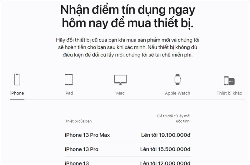 Apple cũng mở chương trình Trade In - Thu cũ đổi mới, với các danh mục nhận thu cũ gồm iPhone, iPad, Mac và Apple Watch. Apple cũng chấp nhận tái chế miễn phí thiết bị cũ không đủ điều kiện Trade In.