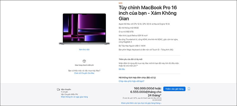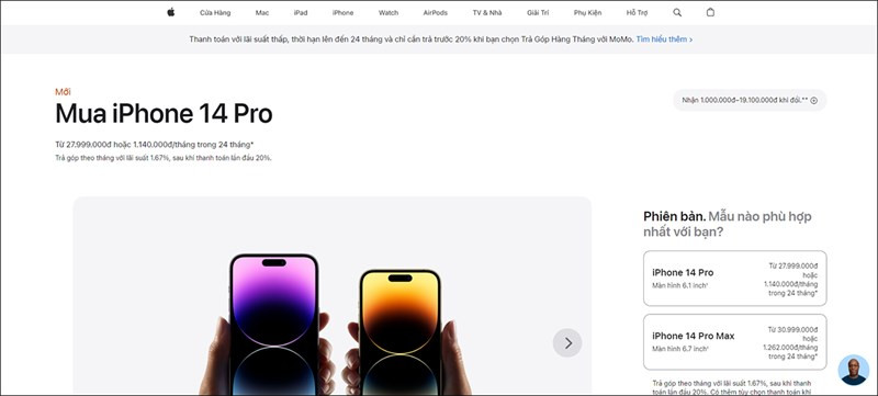 Người dùng được lựa chọn các phiên bản, màu sắc và bộ nhớ phù hợp khi chọn mua sản phẩm. Giá bán được Apple hiển thị theo 2 hình thức là giá trả ngay hoặc giá trả góp hàng tháng.