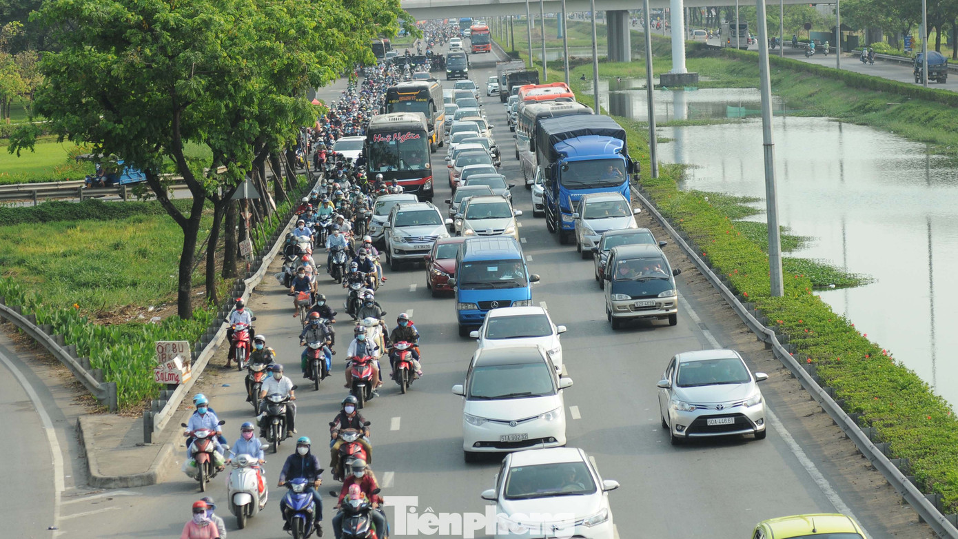Các phương tiện xếp hàng dài nối đuôi nhau nhích từng chút một để vào cao tốc.
