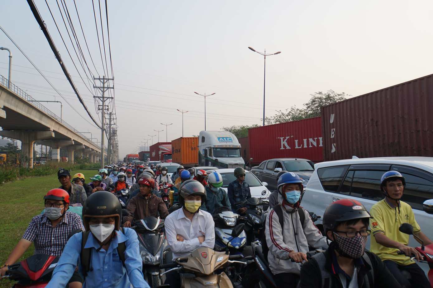 Một trong những nguyên nhân gây kẹt xe là lưu lượng phương tiện chở hàng hóa ra vào các cảng biển ở phía Đông TPHCM tăng cao trong những ngày cận tết Nguyên đán 2020.