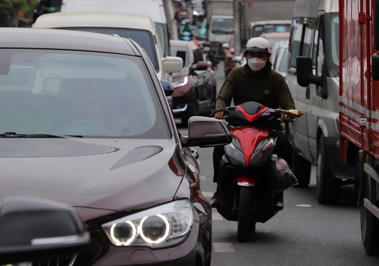 | Nhiều người lao xe lên vỉa hè để thoát cảnh nhích từng mét trên đường. |