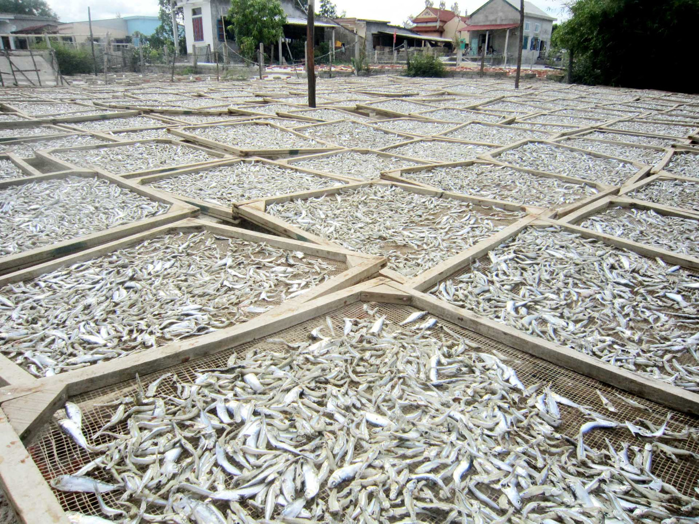 | Sân không đủ, người ta tận dụng mặt đường phơi. Đường đi về bển Cửa Việt những ngày hè nghe tanh mùi cá, hai vên vỉa hè ngay ngắn hàng trăm liếp cá phơi. |