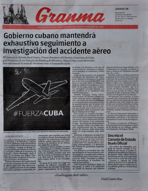 Granma - một trong những tờ báo uy tín nhất ở Cuba đưa tin về vụ tai nạn trên trang nhất số ra ngày 19/5, với bức ảnh một chiếc máy bay trên nền đen. Ảnh: AFP