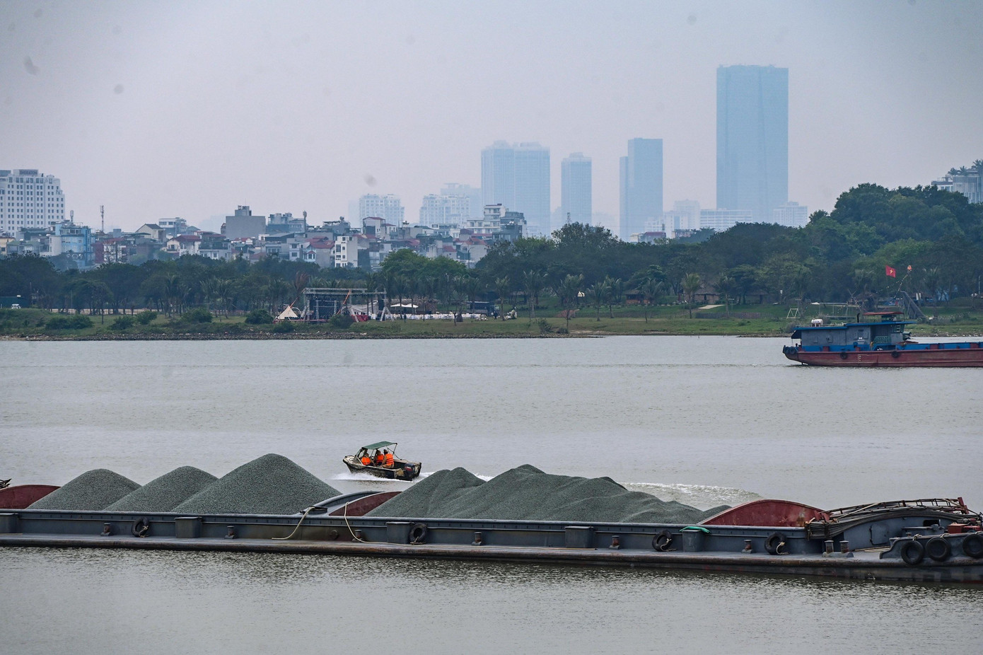 | Tổ công tác kiểm tra tàu thuyền trên tuyến sông Hồng. |