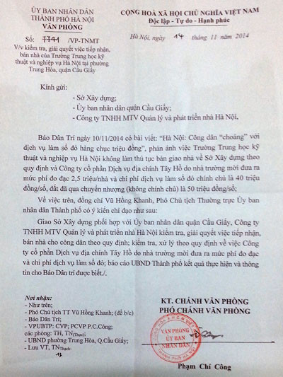 Nội dung Văn bản số 7741/VP-TNMT ngày 14/11/2014, gửi Sở Xâydựng và các đơn vị chức năng truyền đạt ý kiến chỉ đạo của ông Vũ Hồng Khanh -Phó Chủ tịch Thường trực UBND Thành phố, nêu rõ: “Giao Sở Xây dựng phối hợpvới UBND quận Cầu Giấy, Công ty TNHH Quản lý & Phát triển nhà Hà Nội kiểmtra, giải quyết việc tiếp nhận, bán nhà cho công dân theo quy định; kiểm tra, xửlý theo quy định về việc Công ty CP Dịch vụ địa chính Tây Hồ do nhà trường mờiđưa ra mức phí đo đạc và chi phí dịch vụ làm sổ đỏ; báo cáo UBND Thành phố kếtquả thực hiện và thông tin cho báo Dân trí được biết...”.