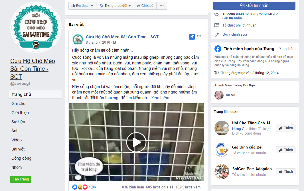 Chúng tôi vô cùng bất ngờ khi biết nhóm Cứu hộ chó mèo Sài Gòn Time - SGT có tới hơn 97.000 người theo dõi và cùng tham gia vào mạng lưới cứu hộ cho các động vật gặp nạn trên địa bàn thành phố Hồ Chí Minh và các tỉnh thành lân cận. Trang Facebook của nhóm cũng là nơi tập hợp các tin nhắn yêu cầu cứu hộ, tìm kiếm thú nuôi, kèm theo mô tả tình trạng và hình ảnh của các con vật.