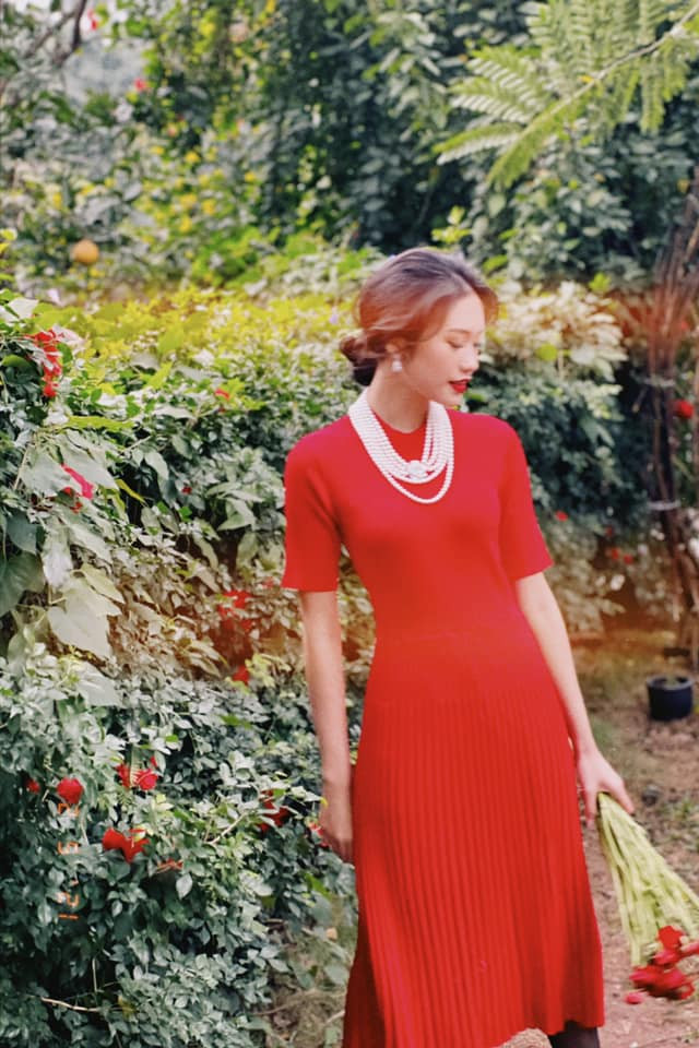 Người đẹp tài năng Doãn Hải My đẹp tựa nàng thơ mùa Xuân trong bộ váy đỏ rực.