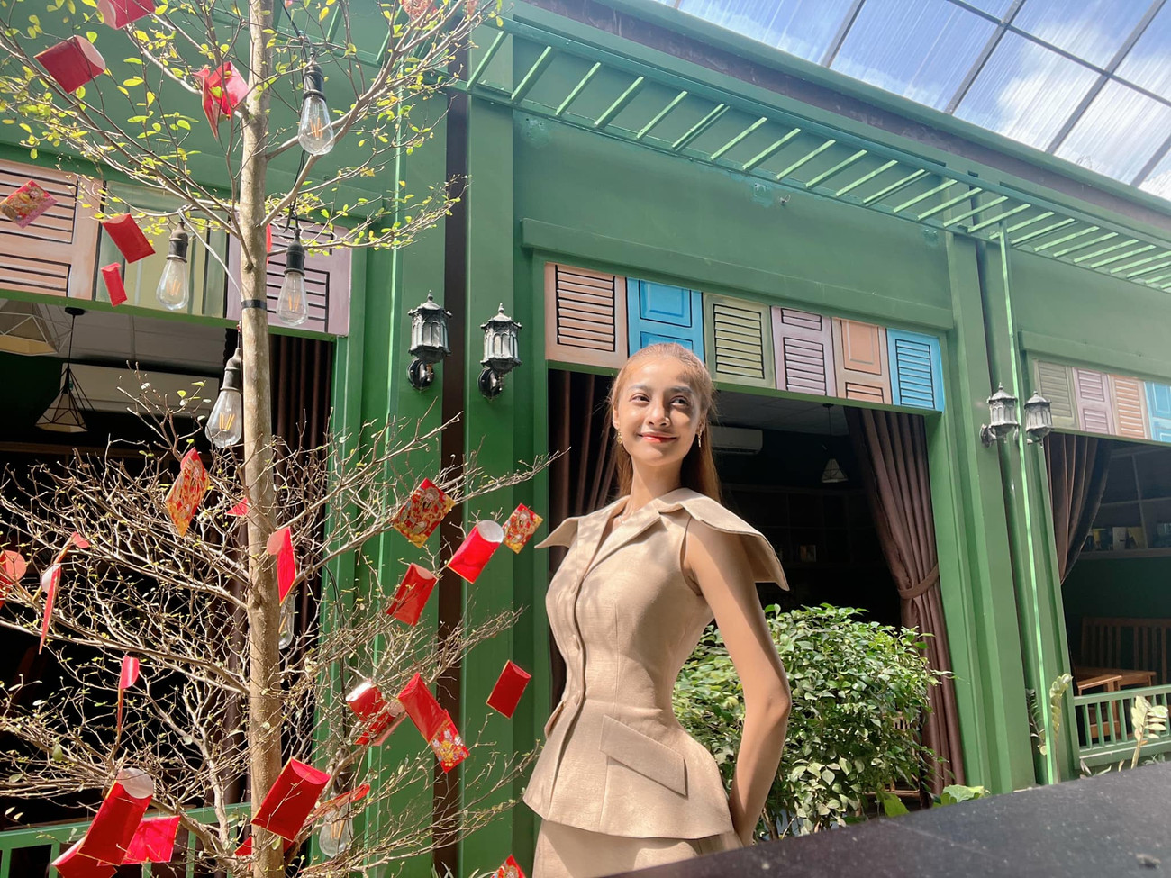 Á hậu Kiều Loan nền nã và thanh lịch với bộ váy gam màu be khi đi du Xuân.