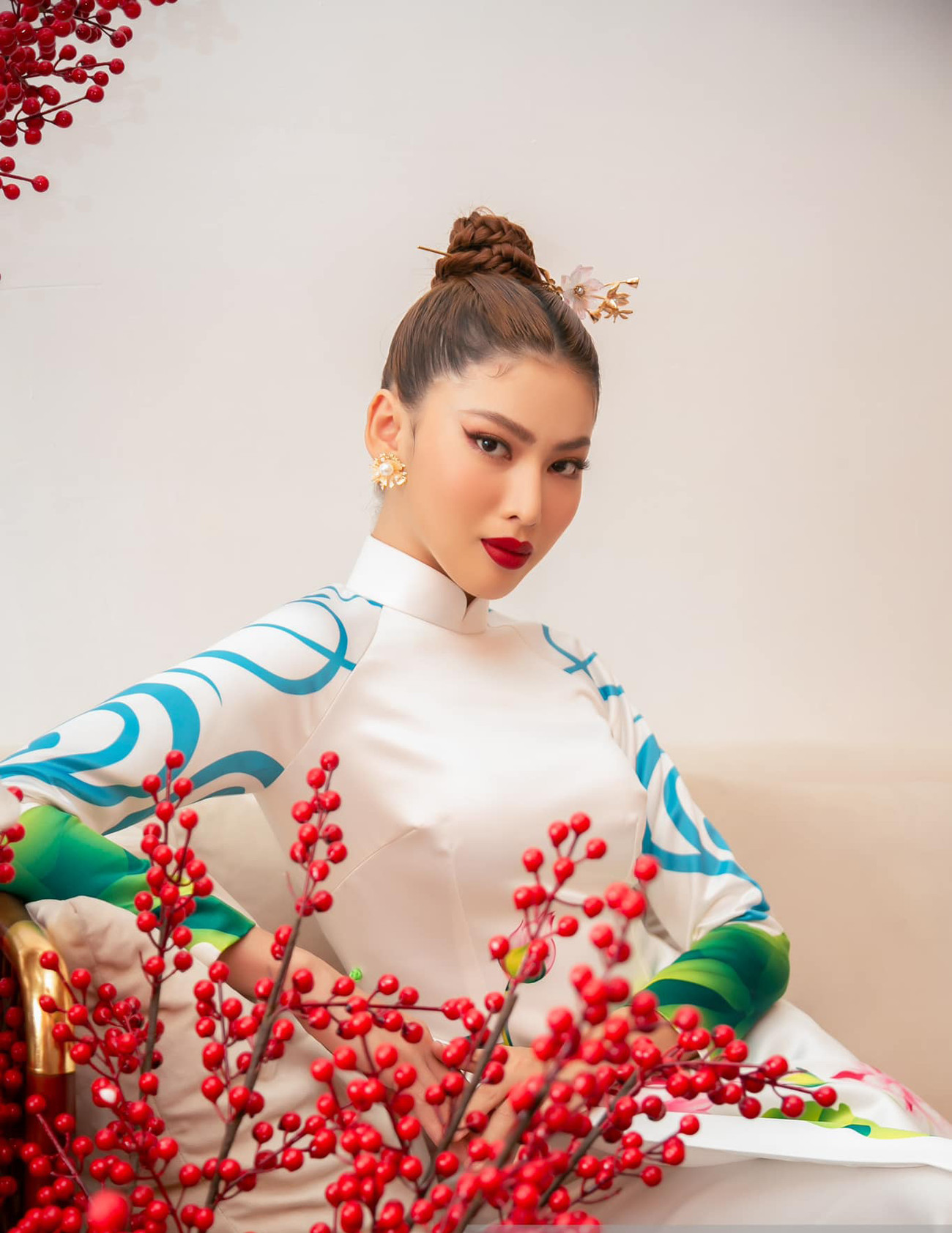 Trong khi đó Á hậu Ngọc Thảo lại cực kỳ sắc sảo với lay-out make-up đậm cùng biểu cảm thần thái ấn tượng khi diện áo dài Tết.