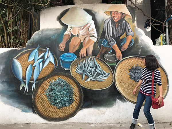 Nguyên mẫu của nhân vật cô bán cá trong bức bích hoạ là bà Ngô Thị Minh ở thôn Trung Vũ