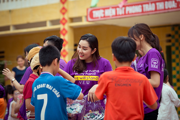 Mang màu áo tím đặc trưng của V.E.O, Bảo Trâm cùng các bạn trẻ gửi tặng những chiếc áo đầu tiên của chiến dịch đến các em học sinh. Bên cạnh đó, cô còn tham gia dạy tiếng Anh cho các học sinh, cũng là một trong những hoạt động thiện nguyện được tổ chức tại đây.