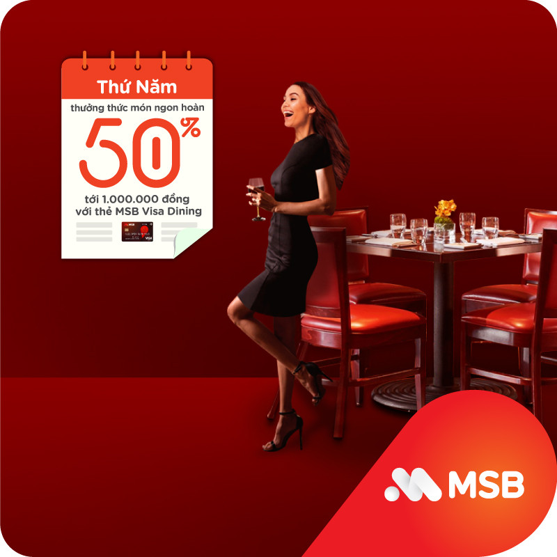 Thứ Năm: Hoàn 50% tối đa 1.000.000 đồng với thẻ MSB Visa Signature Dining khi thưởng thức món ngon tại chuỗi nhà hàng cao cấp: Meiwei, Dolpan sam, Buk buk, RUNAM bistro, Tasaki BBQ, King BBQ từ 1/7 - 31/12/2020. Áp dụng cho hóa đơn từ 500.000 đồng